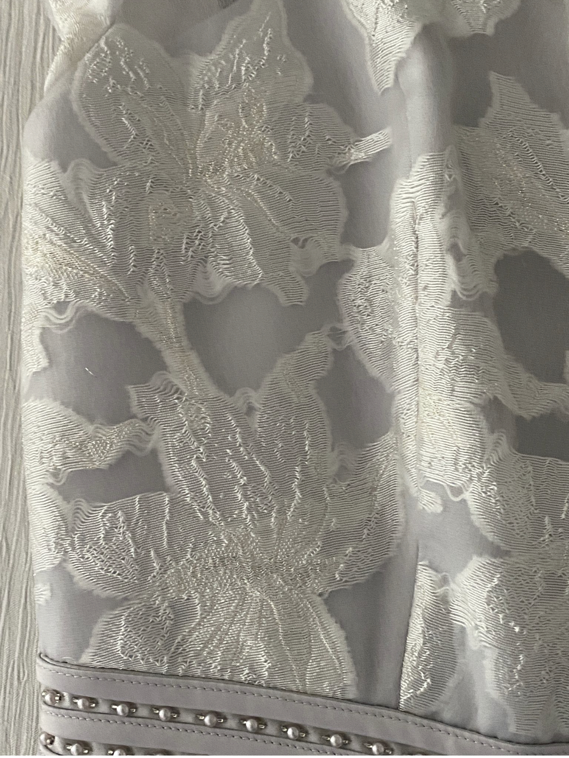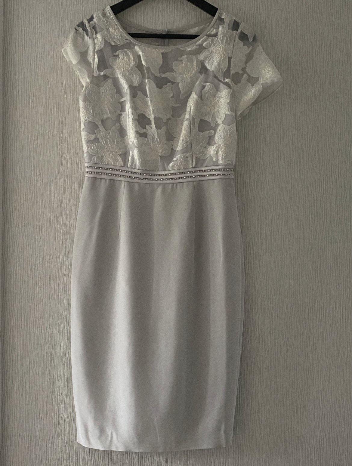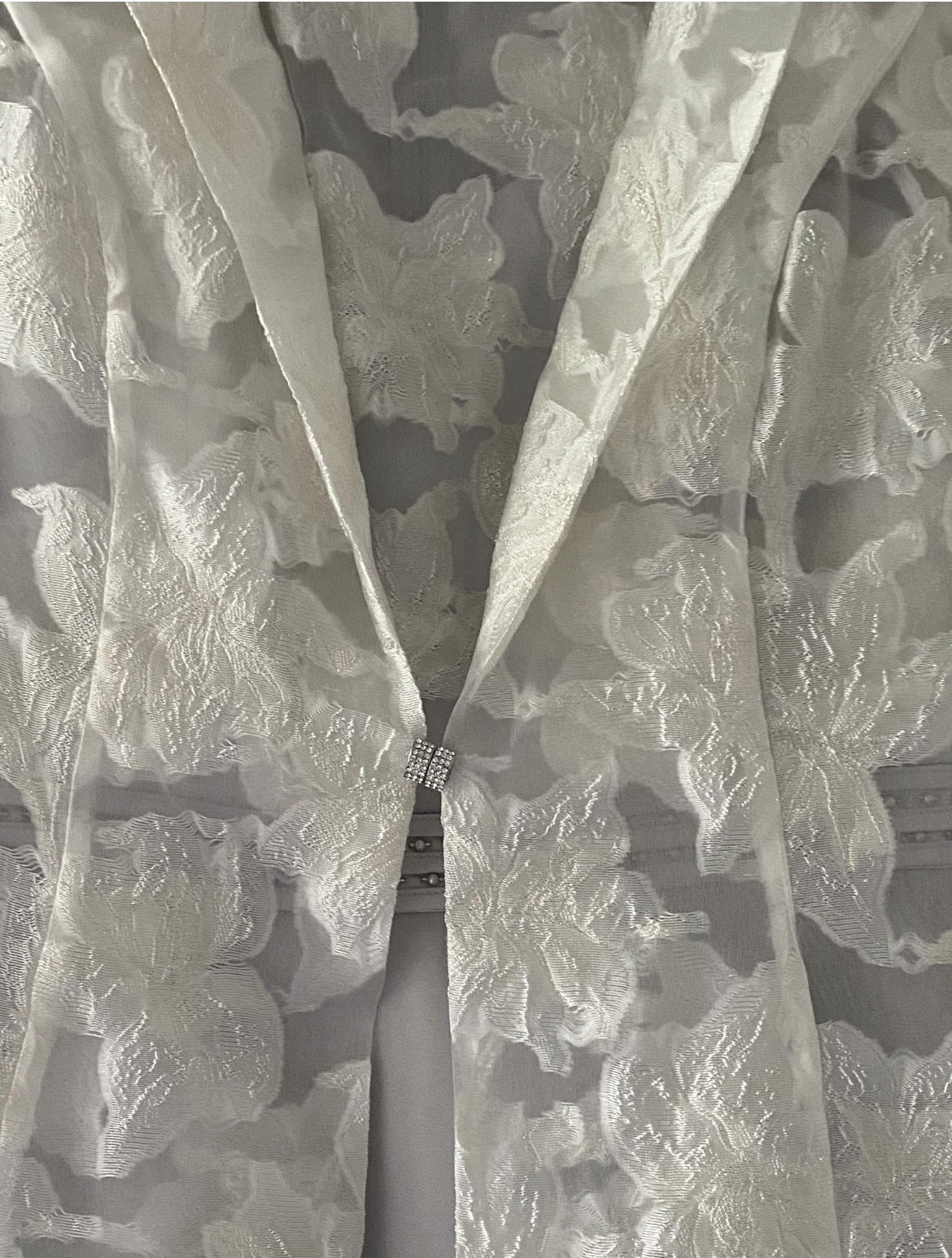 RRP £645, long jacket illusion style, ivory 2 piece set. Diamanté clasp on jacket, size 10.