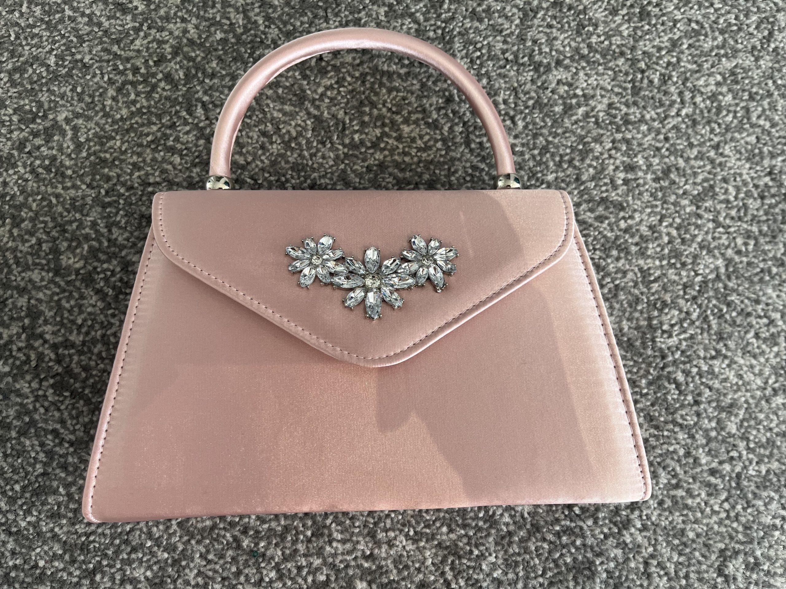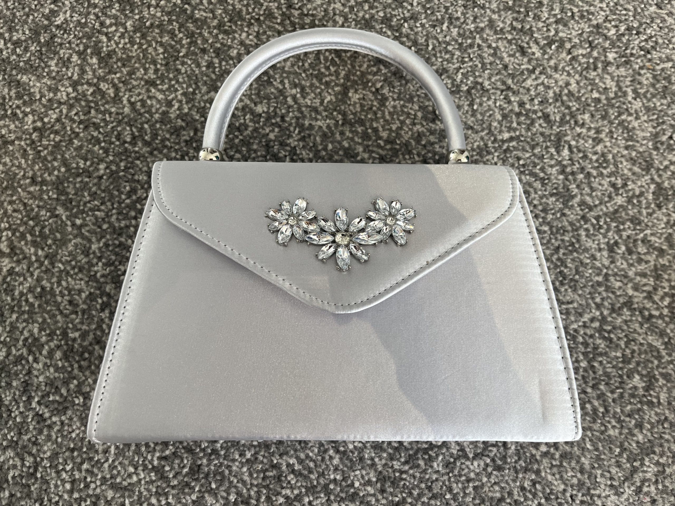 Lovely satin effect handbag with diamanté flower detail and additional chain strap.